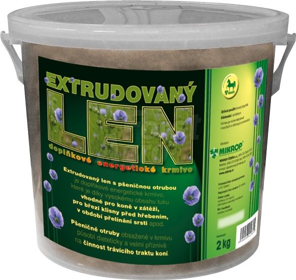- extrudovaný len s pšeničnou otrubou je doplňkové energetické krmivo, které je díky vysokému obsahu tuku vhodné pro koně v zátěži, pro březí klisny před hřebením, v období přelínání srsti apod.